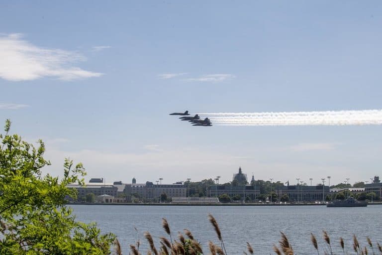 The blue angels flight demonstration highlights the naval academy’s commissioning week festivities.